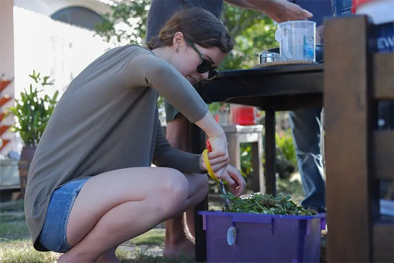 • Using fruit peels, coffee grounds, and vegetable scraps to make fertilizer for garden plants and flowers at homestays.