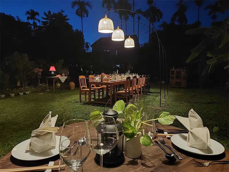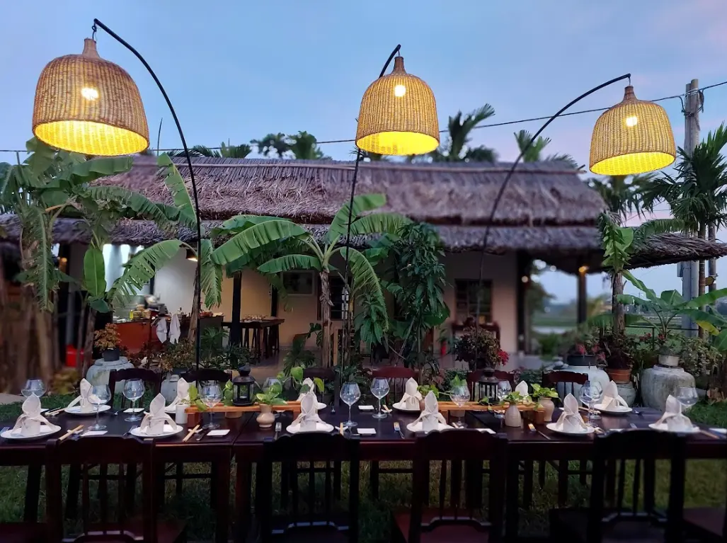 Back at the family home, you’ll learn to prepare signature dishes from Hoi An and Central Vietnam: cao lầu, bánh xèo, slow-braised pork, fresh vegetables, and hand-mixed dipping sauces. Every detail is thoughtfully arranged, from elegant linens and fresh flowers on the table, to gentle lighting and a harmonious blend of traditional dishware and fine wine glasses. The result is a dining experience as refined as any 5-star restaurant, yet still rooted in the heart of rural Vietnam.